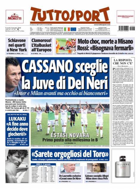 Sul quotidiano torinese Tuttosport si parla di Antonio Cassano che ieri durante una lunga conferenza stampa ha parlato della lotta per lo Scudetto dichiarando di vedere favorite le due milanesi ma con la Juventus pronta a sorprendere tutti.