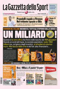 La Gazzetta dello Sport: Un miliardo 27/02/201107/09/2010 di admin MILANO – Un miliardo di eruo, a tanto ammontano gli ingaggi dei calciatori di serie A. Una cifra esorbitante, sconvolgente, alla faccia del fair-play finanziario.. Daniele Berrone – www.calciomercatonews.com