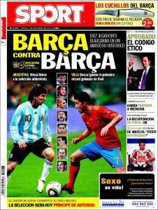 Sul quotidiano catalano Sport si parla della grande amichevole di questa sera tra Spagna e Argentina che vedrà impegnati ben 10 giocatori del Barcellona, in particolare Messi nella Nazionale sudamericana e Villa nella Nazionale Campione del Mondo in carica.