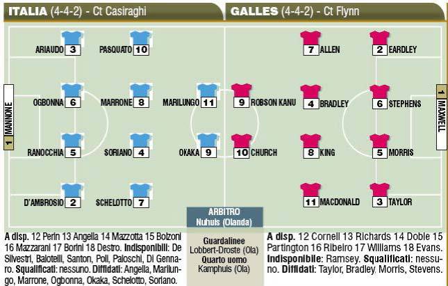 ROMA – La Nazionale di Casiraghi si gioca tutto questa sera con il Galles, ed il c.t. punta su Okaka-Marilungo per scardinare la difesa gallese.