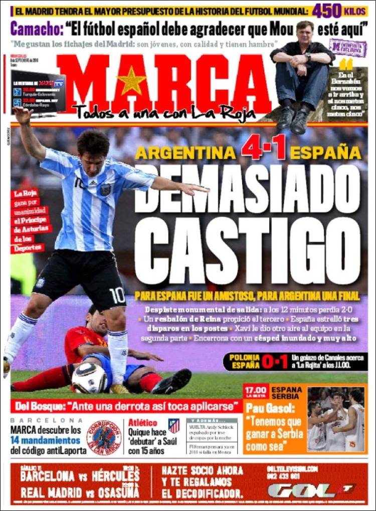Sul quotidiano spagnolo Marca si parla della clamorosa sconfitta della Spagna nell’amichevole contro l’Argentina. La formazione iberica, Campione del Mondo in carica, ha perso quattro a uno contro l’Albiceleste con un Messi straordinario.