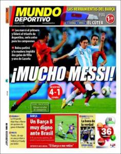 Mundo Deportivo: Molto Messi! 08/09/2010 di Ruggieri Anche il quotidiano catalano Mundo Deportivo esalta la prova di Lionel Messi con la maglia dell’Argentina nell’amichevole vinta dai sudamericani per quattro a uno contro la Spagna Campione del Mondo. Claudio Ruggieri – www.calciomercatonews.com