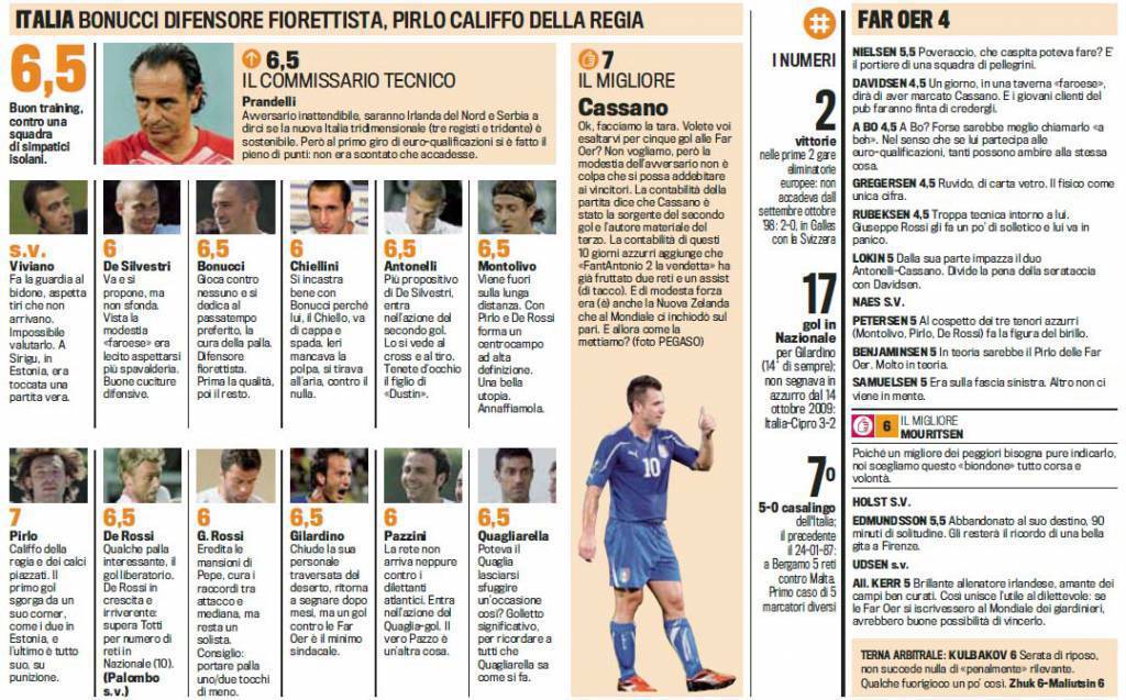 FIRENZE – L’Italia di Prandelli vince anche la seconda partita del girone di qualificazione ai prossimi Europei 2012 battendo cinque a zero le Isole Far Oer. Superlativa la prova di Antonio Cassano ancora una volta leader di questa Nazionale. Ecco le pagelle della Gazzetta dello Sport.