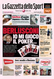 Gazzetta dello Sport: Berlusconi “Io mi gioco il poker” 10/09/2010 di Ruggieri Sulla Gazzetta dello Sport intervista esclusiva con il presidente del Milan Silvio Berlusconi che ha parlato del quartetto magico Ronaldinho-Pato-Robinho-Ibrahimovic rivelando di volerli vedere assieme. Claudio Ruggieri – www.calciomercatonews.com