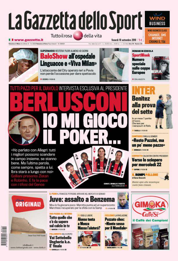 Sulla Gazzetta dello Sport intervista esclusiva con il presidente del Milan Silvio Berlusconi che ha parlato del quartetto magico Ronaldinho-Pato-Robinho-Ibrahimovic rivelando di volerli vedere assieme.