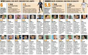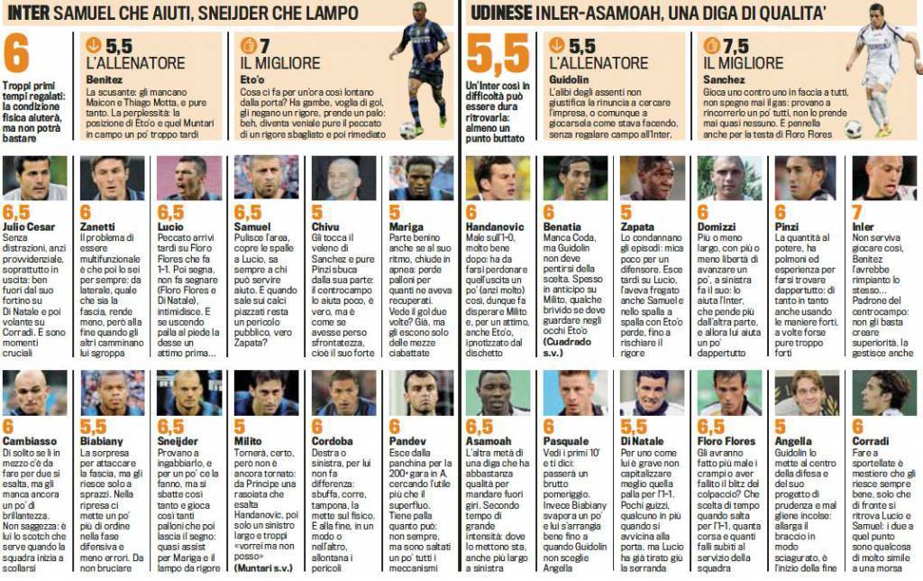 MILANO – La Gazzetta dello Sport ha stilato le pagelle dell’anticipo della seconda giornata di Serie A che si è giocato ieri alle ore 18,00 a San Siro tra Inter e Udinese. I neroazzurri hanno vinto di misura per 2 a 1 grazie al gol dell’attaccante camerunense Samuel Eto’o. Prima sono andati in gol il brasiliano Lucio ed il napoletano Antonio Floro Flores per i bianconeri per il momentaneo 1-1 friulano.