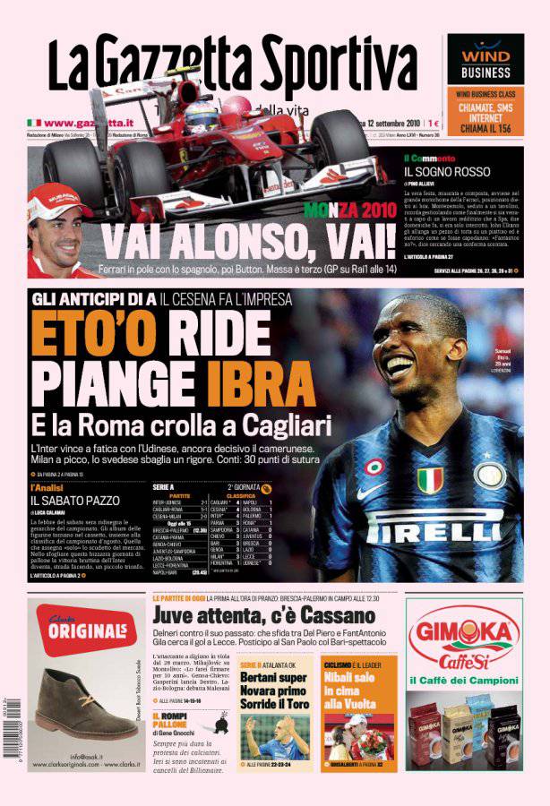 MILANO – Ieri hanno giocato molti campioni nell’anticipo della seconda giornata di Serie A, ma l’unico a ridere è stato Samuel Eto’o che ha festeggiato e realizzato il gol vittoria per l’Inter mentre a Cesena Zlatan Ibrahimovic ha sbagliato un calcio di rigore quando il risultato era già di 2 a 0 per i bianconeri e quello è stato il risultato finale. Anche la Roma ha preso una bella batosta perdendo 5 a 1.