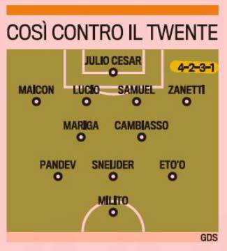 INTER – Rafa Benitez prepara la sfida di Champions League contro il Twente. Il tecnico dell’Inter sembra orientato a confermare il 4-2-3-1 con Milito punta e Sneijder, Pandev ed Eto’o a supporto. In difesa dovrebbe tornare il brasiliano Maicon, assente nelle prime partite di campionato. Ecco la probabile formazione secondo la Gazzetta dello Sport.