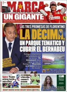 Sul quotidiano spagnolo Marca si parla del Real Madrid ed in particolare del presidente Florentino Perez che ha promesso ai suoi tifosi la vittoria della decima Champions League, un parco tematico e opere di manutenzione allo stadio Bernabeu.