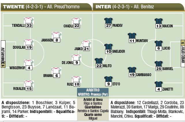 TWENTE INTER – Questa sera l’Inter di Benitez scenderà in campo per la prima giornata di Champions League dove affronterà il Twente in Olanda. Il tecnico nerazzurro opterà per il modulo classico il 4-2-3-1 con Muntari a centrocampo al posto di Mariga. In difesa torna Maicon. Ecco le probabili formazioni secondo il Corriere dello Sport.