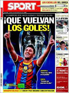 L’altro quotidiano catalano Sport carica il Barcellona in vista del debutto in Champions League contro il Panathinaikos ed in particolare chiede al bomber della Spagna David Villa di portare al trionfo la squadra catalana e vincere la Champions League.