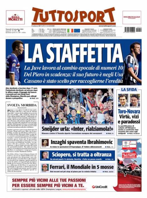 Sul quotidiano torinese Tuttosport si parla del calciomercato Juventus ed in particolare dell’interesse dei bianconeri per Antonio Cassano, talento della Sampdoria che potrebbe raccogliere l’eredità di Del Piero che a fine stagione potrebbe volare negli Usa.