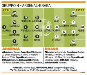 ARSENAL-BRAGA – L’Arsenal debutta in Champions League in casa contro i portoghesi del Braga. Per Wenger tridente d’attacco formato da Arshavin-Chamakh-Nasri, mentre in difesa c’è Squillaci. Ecco le probabili formazioni della Gazzetta dello Sport.