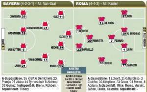 BAYERN MONACO-ROMA – La Roma di Ranieri proverà a riscattare il cinque a uno subito a Cagliari in campionato contro il Bayern Monaco nella prima giornata di Champions League. Un match difficile per i giallorossi. Ranieri conferma la coppia d’attacco Borriello-Totti, con l’inserimento di Brighi a centrocampo. Ecco le probabili formazioni secondo il Corriere dello Sport.