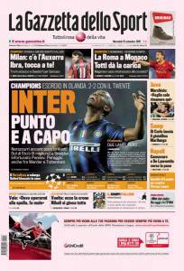 Sulla Gazzetta dello Sport si parla del pareggio dell’Inter contro il Twente in terra d’Olanda nel primo match di Champions League. I nerazzurri sono apparsi in ripresa in particolare dal centrocampo in su, mentre in difesa c’è da registrare qualche meccanismo.