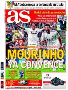 L’altro quotidiano spagnolo As parla della vittoria del Real Madrid contro l’Ajax per due a zero e riporta le dichiarazioni di Josè Mourinho che ha difeso Higuain e Cristiano Ronaldo assicurando che le azioni verranno finalizzate nelle prossime partite.