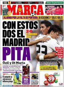 Sul quotidiano Marca si parla della vittoria del Real Madrid nel debutto in Champions League contro l’Ajax grazie alla doppietta di Higuain. Tuttavia il gioco delle “merengues” si è sbloccato grazie ai due nuovi acquisti Ozil e Di Maria.