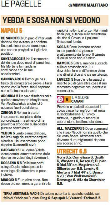 NAPOLI-UTRECHT – Un brutto Napoli pareggia zero a zero in casa contro l’Utrecht nella prima giornata di Europa League. La squadra di Mazzarri è apparsa lenta e macchinosa, i due nuovi acquisti Yebda e Sosa hanno deluso le aspettative. Migliore in campo Cavani che da solo ha impensierito la difesa olandese. Ecco le pagelle della Gazzetta dello Sport e il video.