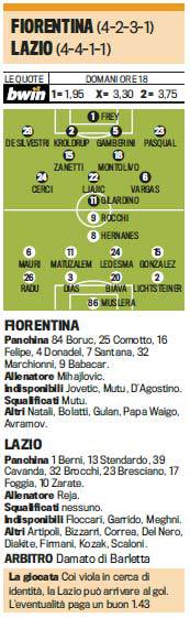 FIORENTINA-LAZIO – Domani nell’anticipo pomeridiano della terza giornata di Serie A, la Fiorentina di Mihajlovic affronterà la Lazio di Reja. Il tecnico viola punta sul giovane gioiello serbo Ljajic e spera che Gilardino possa sbloccarsi mentre Reja promuove da titolare il capitano Rocchi. Ecco le formazioni secondo la Gazzetta dello Sport.