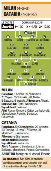 MILAN-CATANIA – Domani sera il Milan affronterà a San Siro il Catania nell’anticipo della terza giornata di Serie A. Il tecnico rossonero Allegri dovrà rinunciare ad Ambrosini e Pato, al loro posto giocheranno Boateng e Robinho. Ecco le probabili formazioni secondo la Gazzetta dello Sport.
