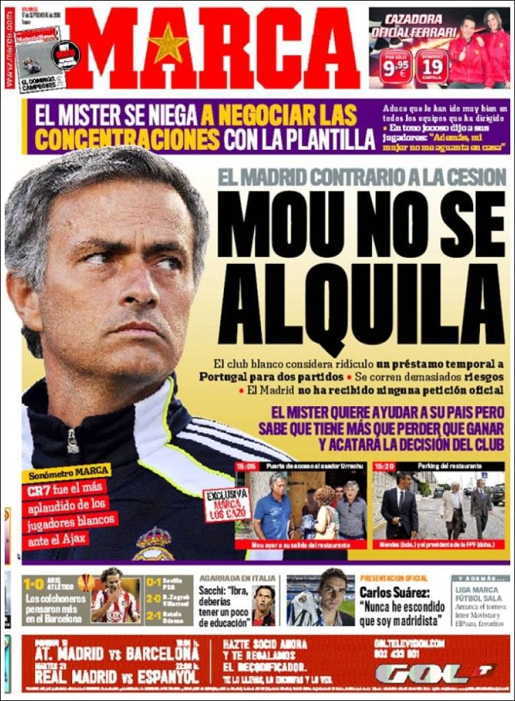 Il quotidiano spagnolo sbatte in prima pagina il caso Mourinho, con il tecnico del Real Madrid che sarebbe nel mirino della Federcalcio portoghese per un impiego part-time nei due match di qualificazioni ai prossimi Europei. Ma gli spagnolo non vogliono “prestare” lo Special One.