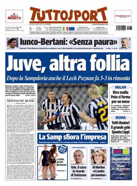 Anche il quotidiano torinese Tuttosport parla del clamoroso pareggio della Juventus in casa contro il Lech Poznan nella prima giornata di Europa League. Un match pieno di insidie per i bianconeri raggiunti all’ultimo minuto dai polacchi.