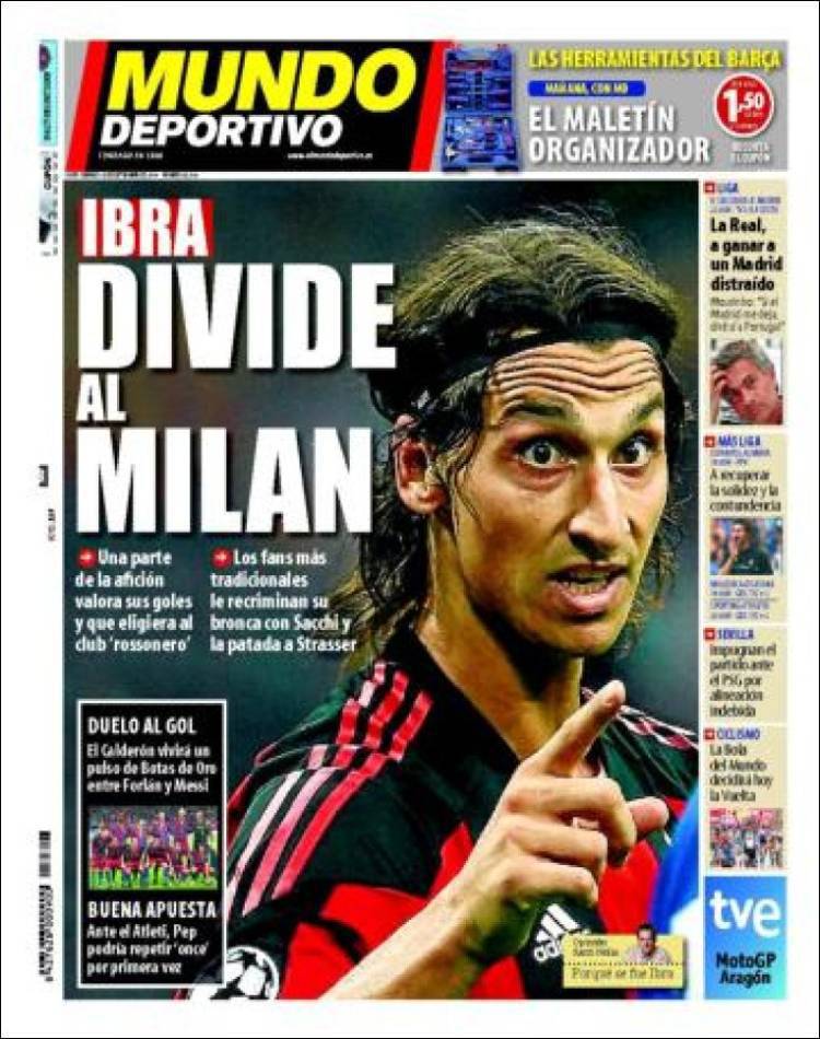 Sul quotidiano catalano Mundo Deportivo si parla dell’ex giocatore del Barcellona Zlatan Ibrahimovic, attaccante del Milan, che secondo il giornale catalano divide i tifosi rossoneri. C’è chi lo acclama dopo i due gol all’Auxerre e chi lo critica per il litigio con Sacchi e per l’accantonamento del giovane Strasser.