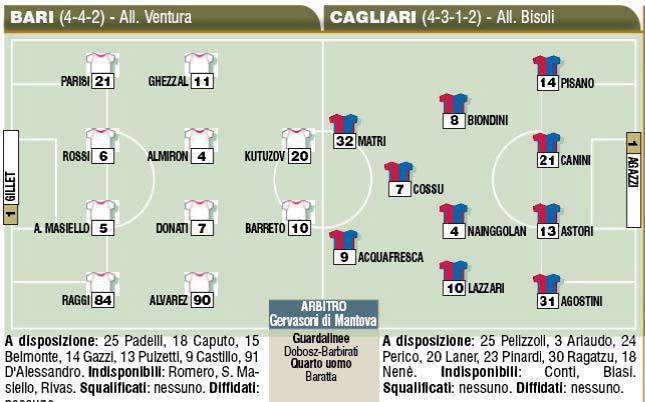 Fantacalcio, probabili formazioni di Bari-Cagliari 19/09/2010 di admin SERIE A – Ecco le probabili formazioni di Bari e Cagliari, prese dal Corriere dello Sport, che scenderanno oggi in campo alle 12 e 30. Francesco Cini – www.calciomercatonews.com