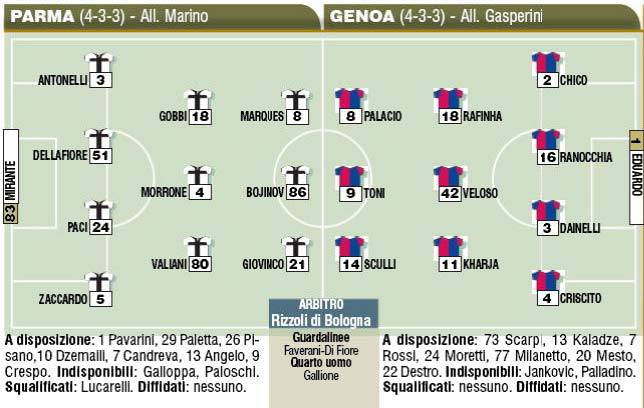 SERIE A – Ecco le ultime formazioni di Parma–Genoa secondo il Corriere dello Sport. Genoa che scende in campo con il tridente d’attacco Palacio, Toni, Sculli, così come il Parma, che schiererà in avanti Marques, Bojinov e Giovinco. Di seguito gli schieramenti.