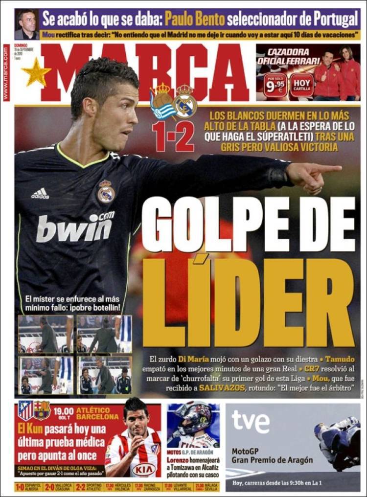 Su Marca viene messa in evidenza la buona prestazione del Real Madrid di Josè Mourinho, che ha vinto per 2 a 1 la partita contro il R. Sociedad con le reti di Cristiano Ronaldo e di Di Maria.