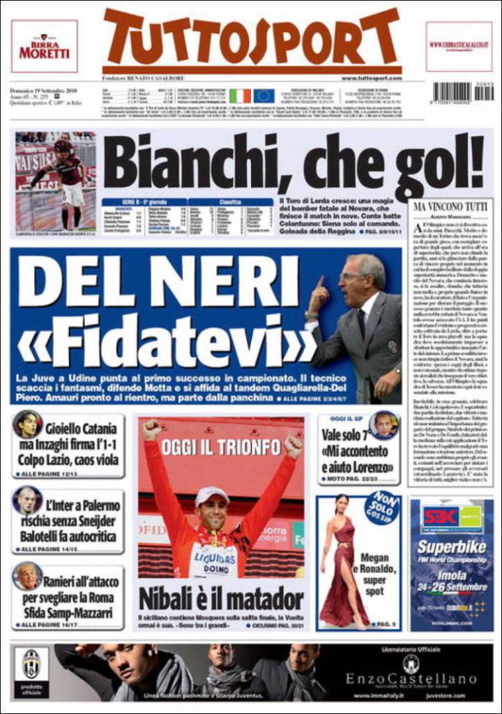 Su TuttoSport, l’allenatore della Juventus Delneri chiede fiducia per la sua squadra, apparsa ancora in uno stato di forma non ottimale. In primo piano anche il gran gol di Bianchi, ormai bandiera del Torino.