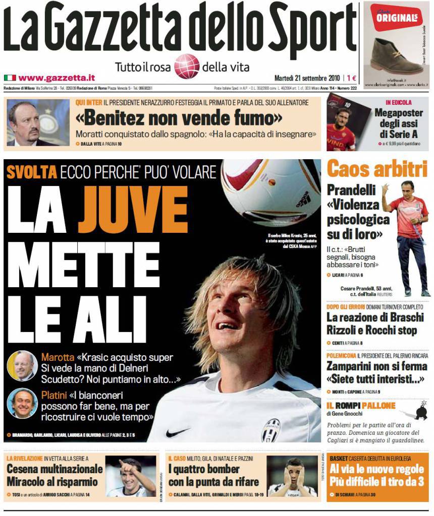 Sulla Gazzetta dello Sport spazio alla Juventus di Delneri che dopo il quattro a zero esterno rifilato all’Udinese è pronta a stupire tutti puntando allo Scudetto. I bianconeri sognano il grande colpo anche grazie a un Krasic in grande spolvero, il serbo ha inizianto a incantare tutto il popolo bianconero.