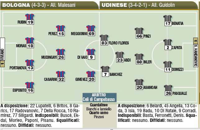 BOLOGNA-UDINESE – L’Udinese di Guidolin, ultima in classifica con zero punti, proverà a vincere nell’insidiosa trasferta di Bologna contro la formazione di Malesani. Turno di riposo per Totò Di Natale, non ancora in perfette condizioni. Modulo nuovo, con il 4-3-1-2, con il giovane Abdi dietro le due punte Sanchez-Floro Flores. Ecco le probabili formazioni del Corriere dello Sport.