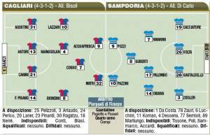 CAGLIARI-SAMPDORIA – Non ci sarà Antonio Cassano nella Sampdoria di Di Carlo che questa sera affronterà il Cagliari in trasferta. Il tecnico blucerchiato opterà per la coppia Pazzini-Pozzi con Guberti dietro le punte. Nel Cagliari confermata la coppia Matri-Acquafresca con Cossu alle spalle. Ecco le formazioni secondo il Corriere dello Sport.