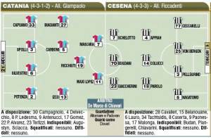CATANIA-CESENA – Ci si aspettava un po’ di turnover da parte di Ficcadenti, e invece il Cesena capolista che farà visita al Catania è lo stesso delle ultime tre giornate, con l’attacco formato da Schelotto-Bogdani-Giaccherini. Ecco le formazioni secondo il Corriere dello Sport.