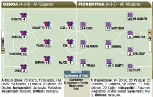 GENOA-FIORENTINA – Prova di fuoco per la Fiorentina di Mihajlovic che a Genova contro la formazione di Gasperini proverà a ritrovare i tre punti. Il tecnico serbo cambia modulo e passa al 4-3-3 con l’inserimento di Dondale a centrocampo. In attacco tridente formato da Cerci-Gilardino-Vargas. Ecco le probabili formazioni secondo il Corriere dello Sport.