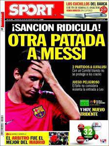 Sul quotidiano catalano Sport si grida allo scandalo per la squalifica di due giornate inflitta a Ujfalusi per il terribile fallo su Messi. Sport parla di sanzione ridicola visto che anche le immagini hanno dimostrato la pericolosità del fallo del giocatore dell’Atletico Madrid.