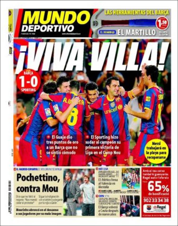 Il quotidiano catalano Mundo Deportivo parla dello striminzito uno a zero casalingo del Barcellona contro lo Sporting Gijon grazie al gol dell’ex attaccante del Valencia David Villa. Tre punti importanti in un match in cui il Barcellona, orfano di Messi, non riesce a dare spettacolo.