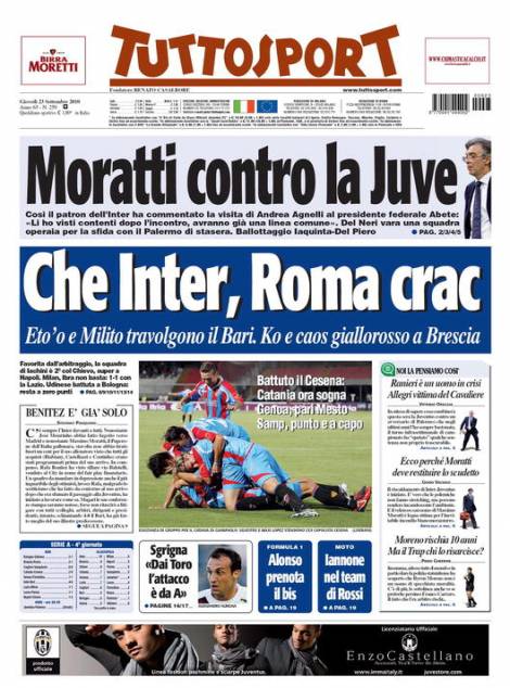 Sul quotidiano torinese Tuttosport si parla della convincente vittoria dell’Inter di Benitez in casa contro il Bari. I nerazzurri travolgono quattro a zero la formazione di Ventura e si portano da soli in vetta alla classifica. La Roma di Ranieri perde a Brescia contestando duramente il guardalinee Ayroldi.