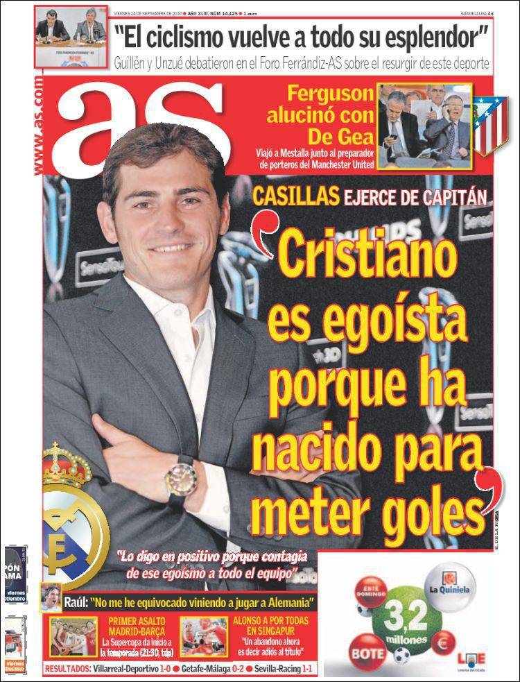 Sul quotidiano spagnolo As intervista esclusiva al capitano e portiere del Real Madrid Iker Casillas che ha parlato di Ronaldo accusato di essere egoista. Il portiere Campione del Mondo con la Spagna ha confermato l’egoismo del portoghese ma lo ha difeso dicendo che Ronaldo è nato per segnare.