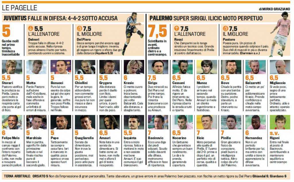 JUVENTUS-PALERMO – Ieri sera i tifosi della Juventus hanno potuto ammirare Javier Pastore, fantasista del Palermo che è stato senza dubbio il migliore in campo assieme a Del Piero. Bene anche Bacinovic, Ilicic e Pinilla nel Palermo, mentre nei bianconeri male Quagliarella e Marchisio. Ecco i voti della Gazzetta dello Sport.
