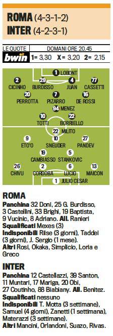 ROMA-INTER – Per il big match di domani sera Claudio Ranieri, tecnico della Roma, dovrebbe recuperare Francesco Totti, Daniele De Rossi e Nicolas Burdisso. Mancherà il portiere Julio Sergio, al suo posto giocherà Lobont. Benitez invece proverà a recuperare Samuel, in caso di forfait dell’argentino pronto Cordoba. Ecco le probabili formazioni secondo la Gazzetta dello Sport.