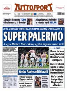 Il quotidiano torinese Tuttosport parla di super Palermo, la squadra di Delio Rossi annichilisce lo stadio Olimpico di Torino e batte la Juventus per tre a uno con un Pastore immenso autore del primo gol dei rosanero. Le altre due marcature sono state realizzate da Ilicic e Bovo. Per la Juventus a segno Iaquinta.