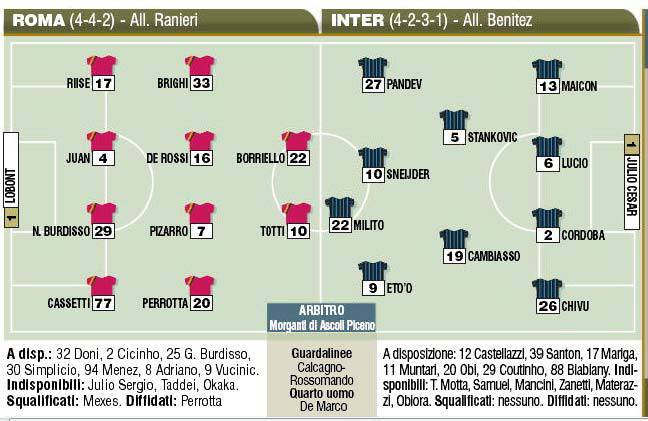 ROMA-INTER – Questa sera lo Stadio Olimpico sarà il teatro del big match della quinta giornata di campionato tra Roma e Inter. I giallorossi dovranno assolutamente vincere per evitare la crisi, i nerazzurri invece vorranno allungare il passo. Ranieri recupera Riise, Burdisso, De Rossi e Totti e sceglie un 4-4-2 prudente, mentre Benitez conferma l’undici di mercoledì sera con Cordoba al posto di Samuel. Ecco le formazioni secondo il Corriere dello Sport.