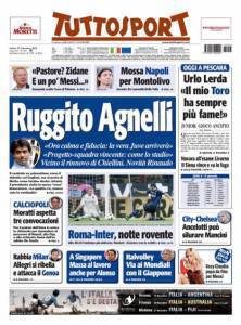 Sul quotidiano sportivo Tuttosport si parla delle dichiarazioni del presidente della Juventus Andrea Agnelli che ha rincuorato i giocatori bianconeri dopo la sconfitta contro il Palermo. Non solo, si è parlato del nuovo stadio e dell’imminente rinnovo di Chiellini.