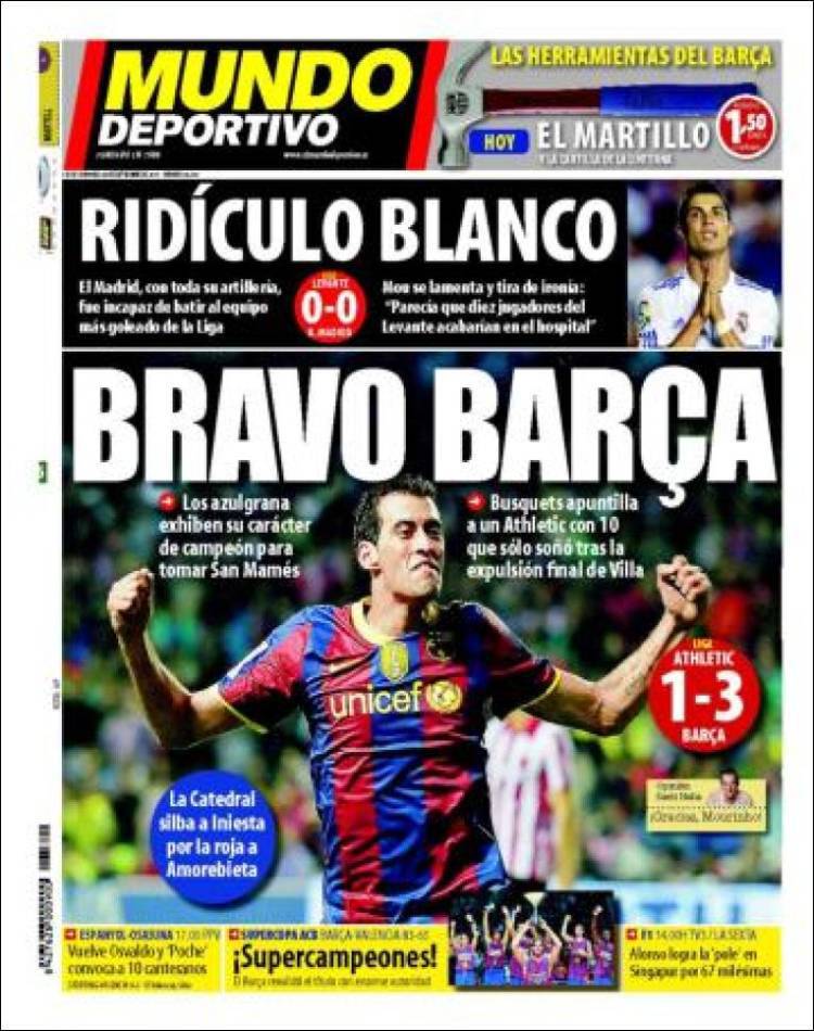 Sul Mundo Deportivo nonostante la pesante assenza di Leo Messi, costretto ai box dopo l’intervento killer di Ujfalusi, il Barcellona di Guardiola vince e convince per 3 a 1, risalendo così la classifica.