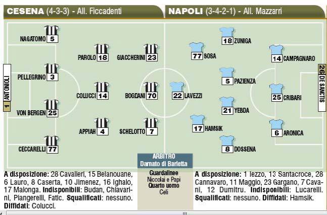 CESENA – Oggi parte la quinta giornata di campionato alle ore 12,30 dopo gli anticipi di Milan-Genoa e Roma-Inter di ieri sera. Le prime due squadre ad andare in campo saranno Cesena-Napoli che si sfideranno in Emilia Romagna. I padroni di casa sono una squadra ben organizzata, tanto da aver messo in difficoltà la Roma fuori casa e ad aver vinto contro il Milan in casa, mentre il Napoli è una mina vagante in grado di sfornare prestazioni stupefacenti con partite col risultato sorprendente.
