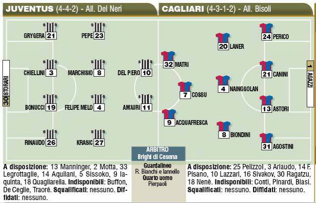 SERIE A – Ecco le probabili formazioni, aggiornate, di Juventus-Napoli, posticipo di Serie A in programma alle 20:45; Juventus in campo con il modulo 4-4-2: Storari, Rinaudo, Bonucci, Chiellini, Grygera; Krasic, Melo, Marchisio, Pepe; Del Piero, Amauri. Cagliari con il 4-3-1-2: Agazzi; Pisano, Canini, Astori, Agostini; Biondini, Nainggolan, Lazzari; Cossu; Matri, Acquafresca. Di seguito la foto degli schieramenti secondo il Corriere dello Sport.