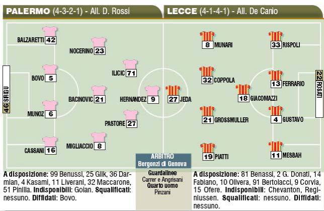 SERIE A – Palermo reduce dalla vittoria contro la Juventus, scende in campo con il modulo ad alberto di Natale, con Pastore e Ilicic trequartisti a sostegno dell’unica punta Hernandez. Forte di un inizio stagione sopra le aspettative, la squadra di De Canio proverà a fermare il Palermo con un’11 titolare molto rimaneggiato. Di seguito la foto degli schieramenti di Palermo–Lecce.
