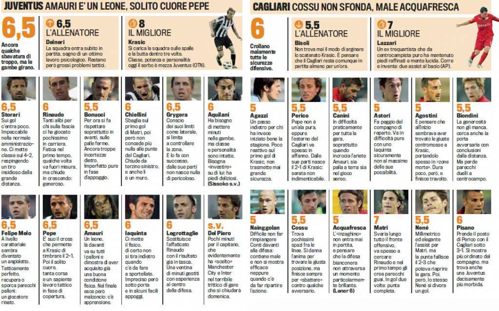 FANTACALCIO JUVENTUS-CAGLIARI – Un super Krasic trascina la Juventus nella vittoria casalinga contro il Cagliari di Bisoli. Quattro a due il punteggio finale con tripletta del serbo e gol di Bonucci per la Juventus, mentre nel Cagliari doppietta di Matri. Ecco i voti secondo la Gazzetta dello Sport.